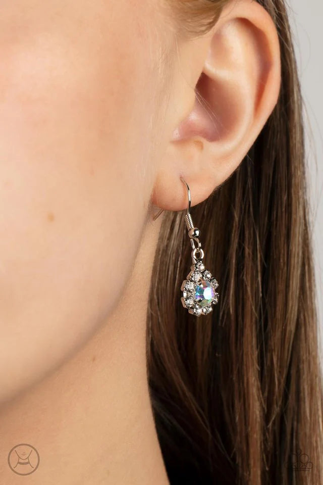 A dainty strand of glittery white rhinestones encircle solitaire iridescent rhinestones around the neck, creating a glitzy fringe. Features an adjustable clasp closure.