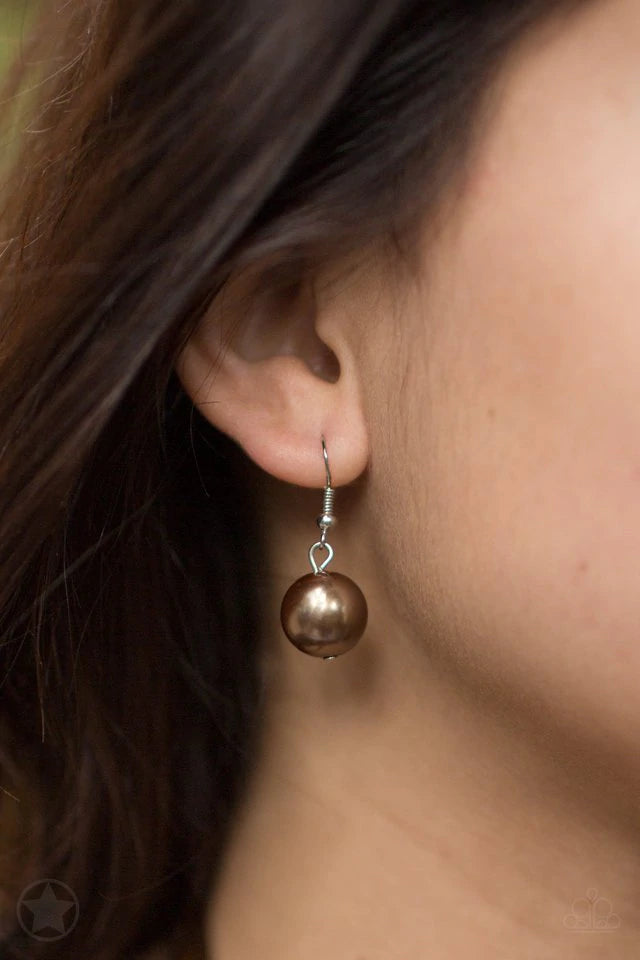 A silky brown ribbon replaces a traditional chain to give an elegant look. Pearly brown beads and funky silver pieces intermix with varying lengths of silver chains to give a fresh take on a Victorian-inspired piece. Sold as one individual necklace. Includes one pair of matching earrings.