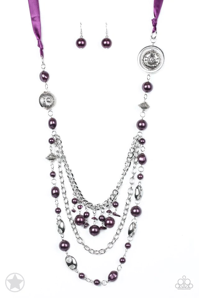 A silky purple ribbon replaces a traditional chain to create a timeless look. Pearly deep purple beads and funky silver pieces intermix with varying lengths of silver chains to give a fresh take on a Victorian-inspired piece. Sold as one individual necklace. Includes one pair of matching earrings.