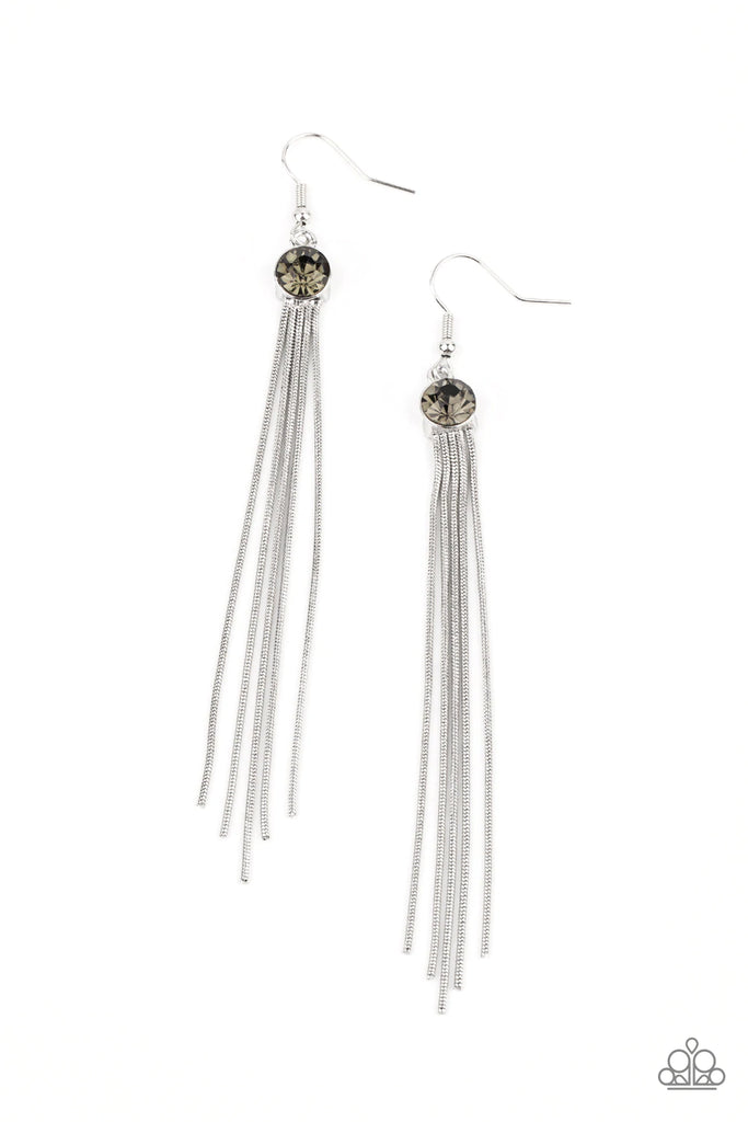 Dainty silver snake-like chains stream from the bottom of a smoldering smoky rhinestone, creating a tapered tassel. Earring attaches to a standard fishhook fitting.