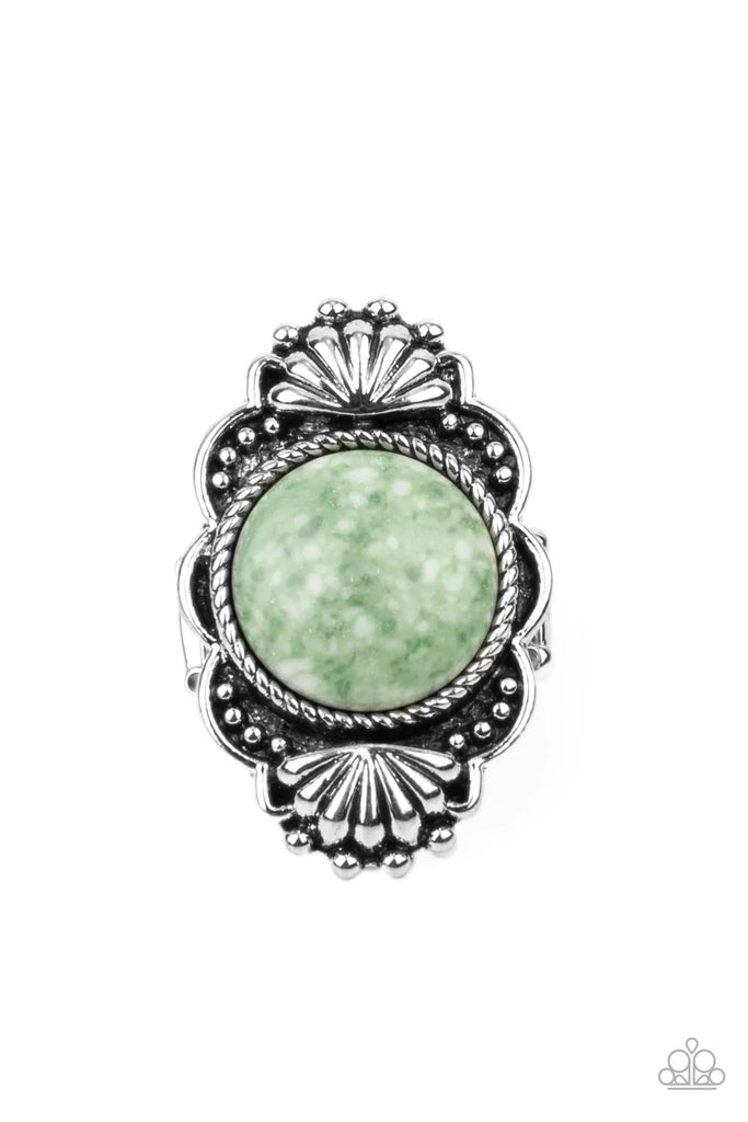 Adorned in silver seashells and dainty silver studs, the center of a scalloped silver frame is dotted with an oversized green stone for an artisan inspired finish. Features a stretchy band for a flexible fit.