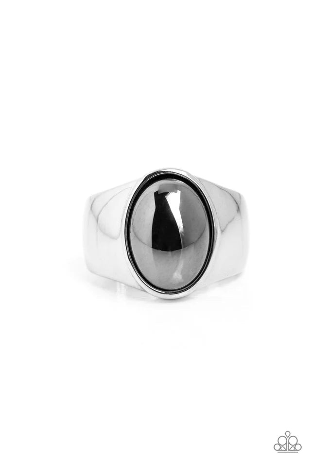 Chiseled into an edgy oval, reflective gunmetal is pressed into the center of a thick, glistening silver band for a trend-setting statement. Features a stretchy band for a flexible fit.
