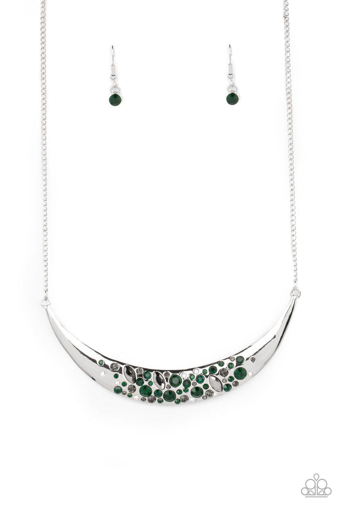 A stunning collection of round emerald and smoky rhinestones, dainty white rhinestones and marquise cut hematite rhinestones shimmer across the surface of a shiny silver crescent. The bejeweled plate falls just below the collar in a dazzling finish. Features an adjustable clasp closure.