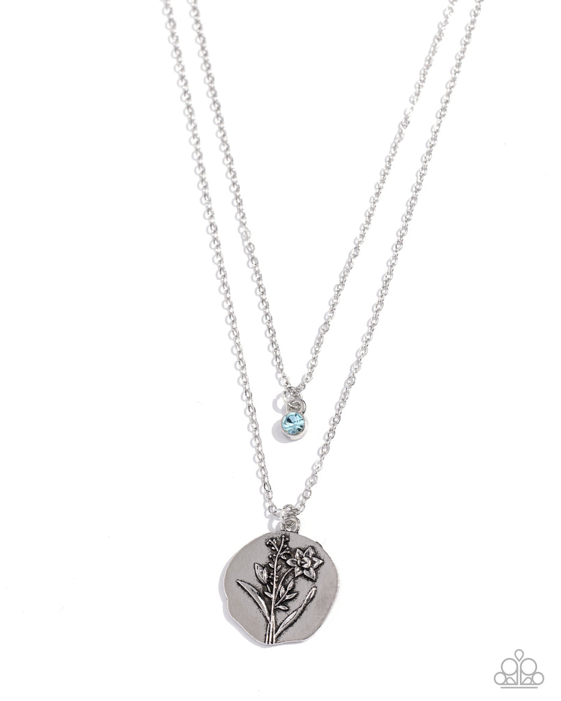 Two shimmery silver chains layer down the chest. Featuring an aquamarine rhinestone in a silver frame, the uppermost strand gives way to a classic silver pendant featuring an embossed daffodil flower, flawlessly displaying the sentimental symbols that celebrate those born in March.