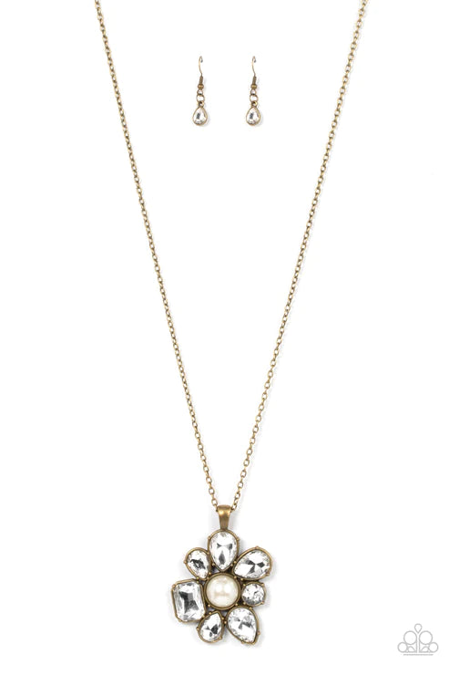 Encased in pronged brass fittings, a mismatched collection of oversized teardrop, round, and emerald cut rhinestones asymmetrically blooms from a bubbly white pearl drop center for a surprisingly sparkly floral pendant at the bottom of a brass chain. Features an adjustable clasp closure.