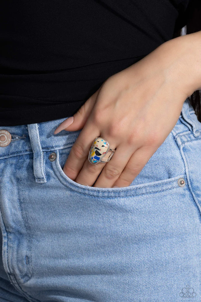 Wrapped in a silver, abstract, teardrop frame, a pale yellow stone, featuring multicolored speckles gleams atop the finger. Anchoring the funky stone, airy silver frames create space for the finger to peek out. Features a stretchy band for a flexible fit. As the stone elements in this piece are natural, some color variation is normal.