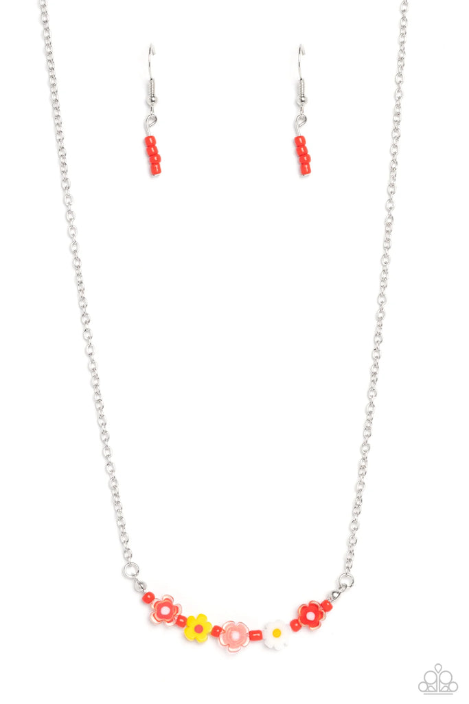 Infused at the bottom of a dainty silver chain, a row of flower beads in shades of red, yellow, and white glide down the neckline. Separating each floral bead, red seed beads create additional pops of color against the seasonal flowers. Features an adjustable clasp closure.