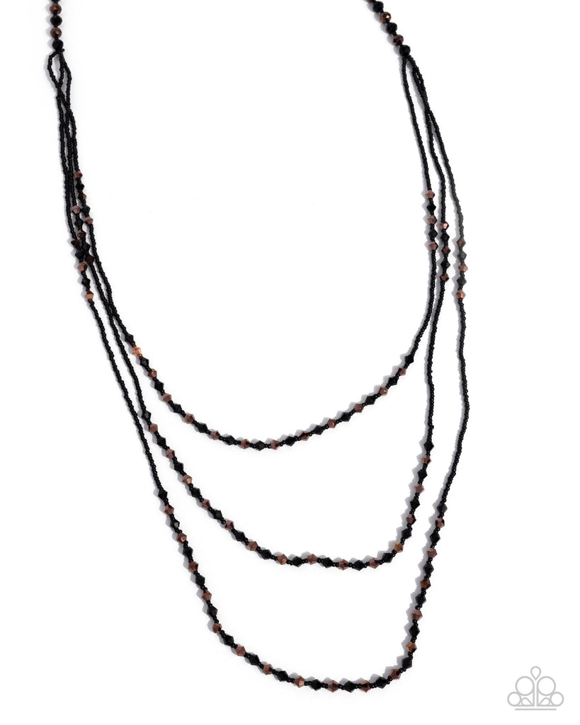 A strand of faceted black and aurum beads separated by black seed beads cascades into rows of black seed beads, accented with smaller aurum and black faceted beads, creating a long layered silhouette below the collar. The metallic pops of shimmer contrast effortlessly against the black strands, creating a dramatically sleek statement piece. Features an adjustable clasp closure.