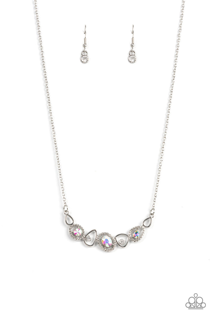 An incandescent assortment of shiny silver frames, dainty white rhinestones, and oversized iridescent gems delicately coalesce into a statement-making sparkle below the collar. Features an adjustable clasp closure.