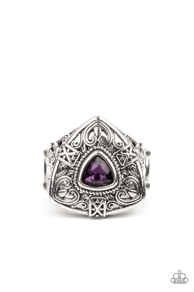 A triangular cut purple rhinestone adorns the center of a decorative silver frame swirling with filigree details. The ornate centerpiece sits atop matching silver frames, coalescing into a regal band. Features a stretchy band for a flexible fit.