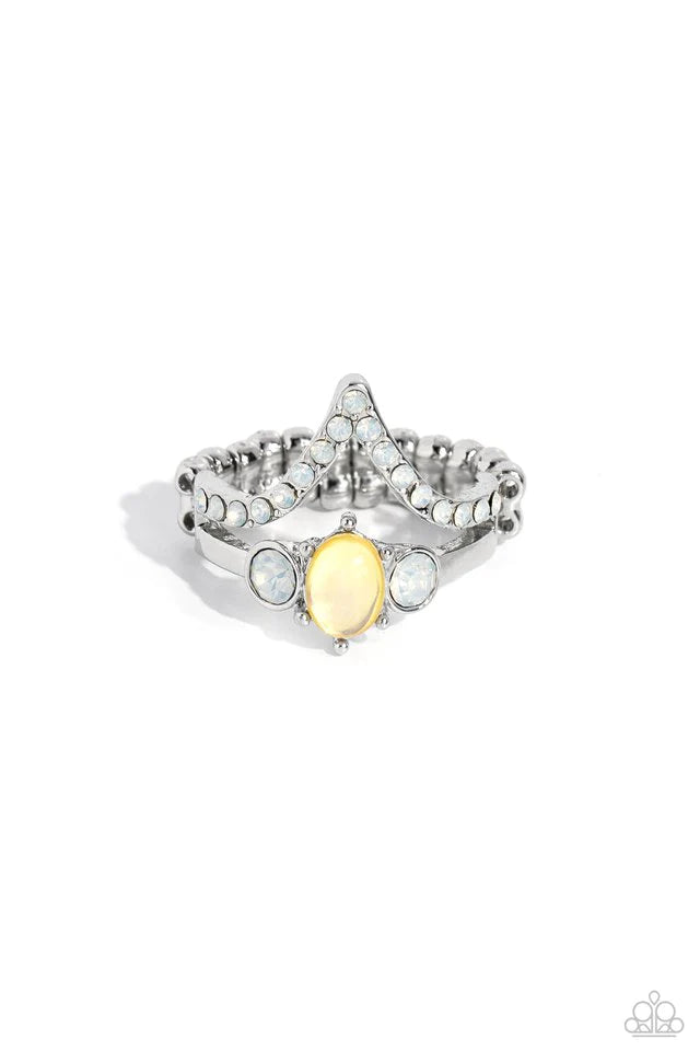 Featuring an opalescent shimmer, white gems, and a glassy yellow oval-cut gem are pronged in place at the center of a silver band. An upside-down V-shaped frame, encrusted in a row of dainty opalescent white rhinestones, rises above the colorful gems for a sassy finish. Features a dainty stretchy band for a flexible fit.