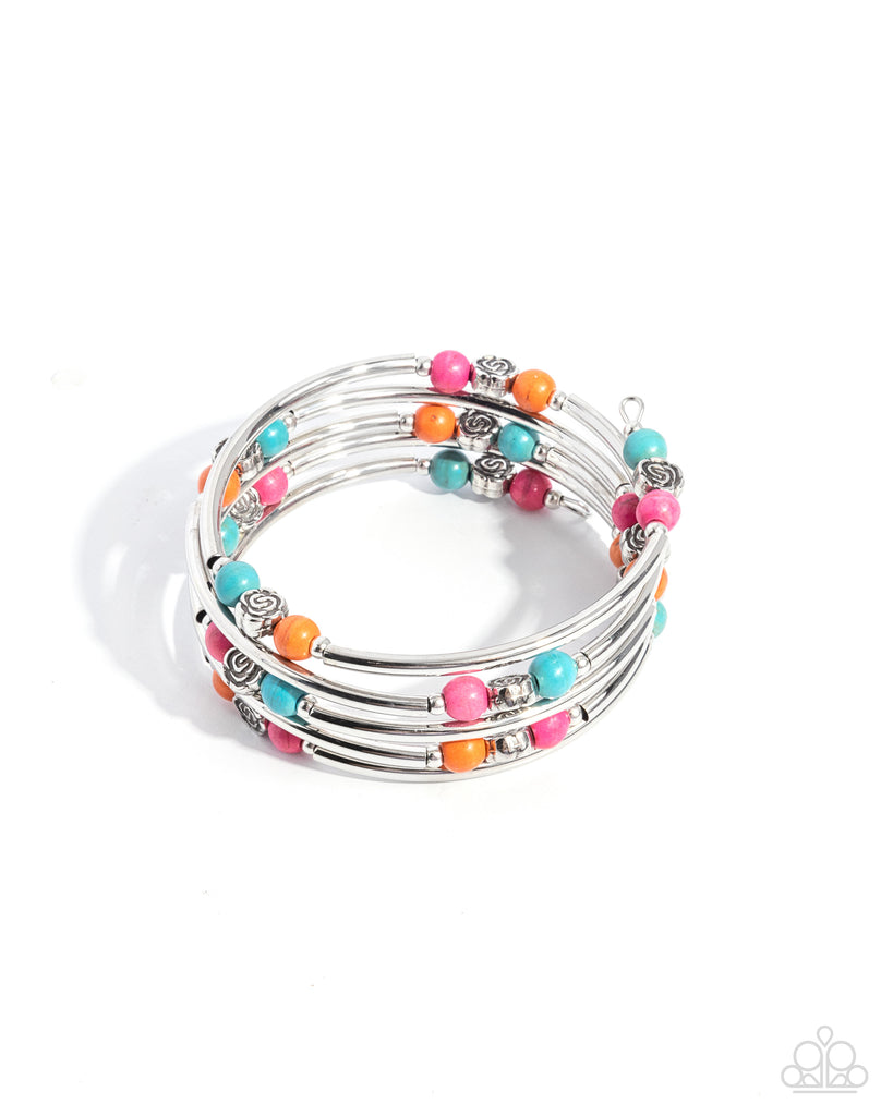 Threaded along a coiled wire, silver bars are interrupted by silver rosette beads, classic silver beads, and orange, turquoise, and hot pink stone beads creating an earthy infinity wrap-style bracelet around the wrist. As the stone elements in this piece are natural, some color variation is normal.