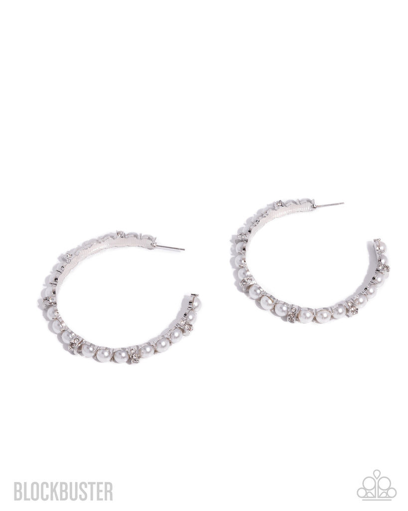 Pronged in elevated silver fittings, lustrous white half-pearls curl around the ear, creating a timeless lure. Airy silver sections, adorned in sparkling white rhinestones, are effortlessly sprinkled among the sea of pearls, infusing the design with capricious shimmer. Earring attaches to a standard post fitting. Hoop measures approximately 2 1/4" in diameter.