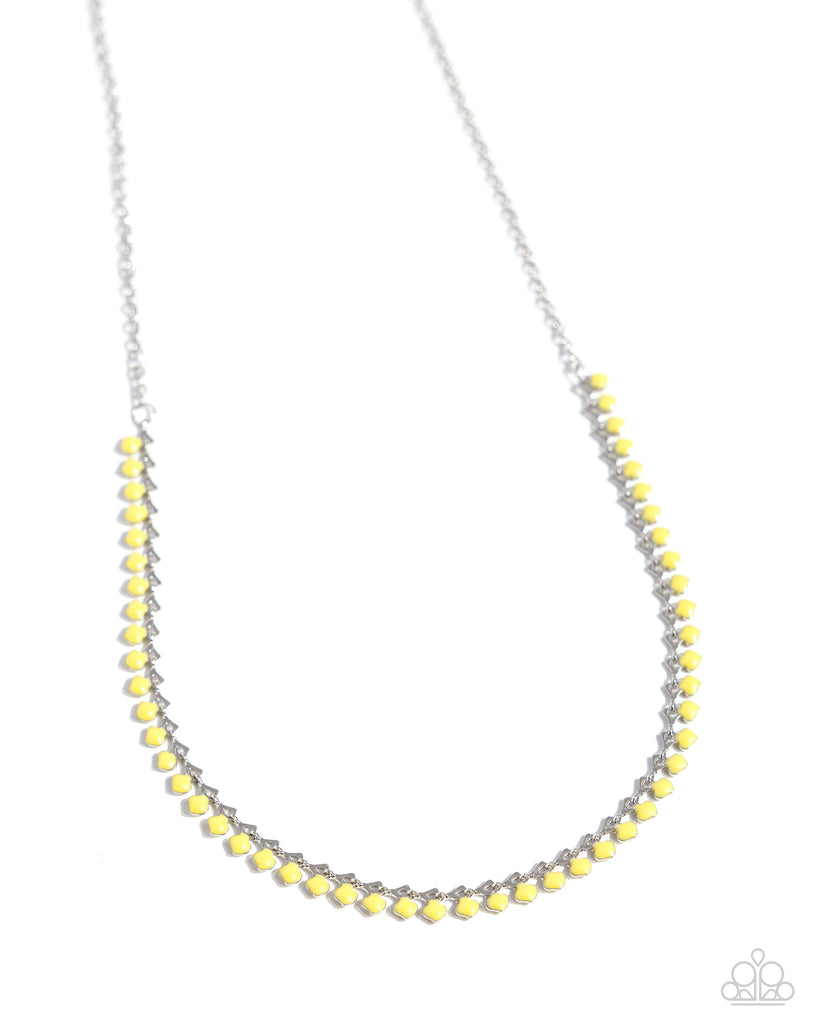Connecting to a dainty silver chain, a collection of dainty silver jump rings coalesces around the neckline. Dripping below the jump rings, a collection of Lemon Drop beads adds a pop of vibrant color to the design. Features an adjustable clasp closure.
