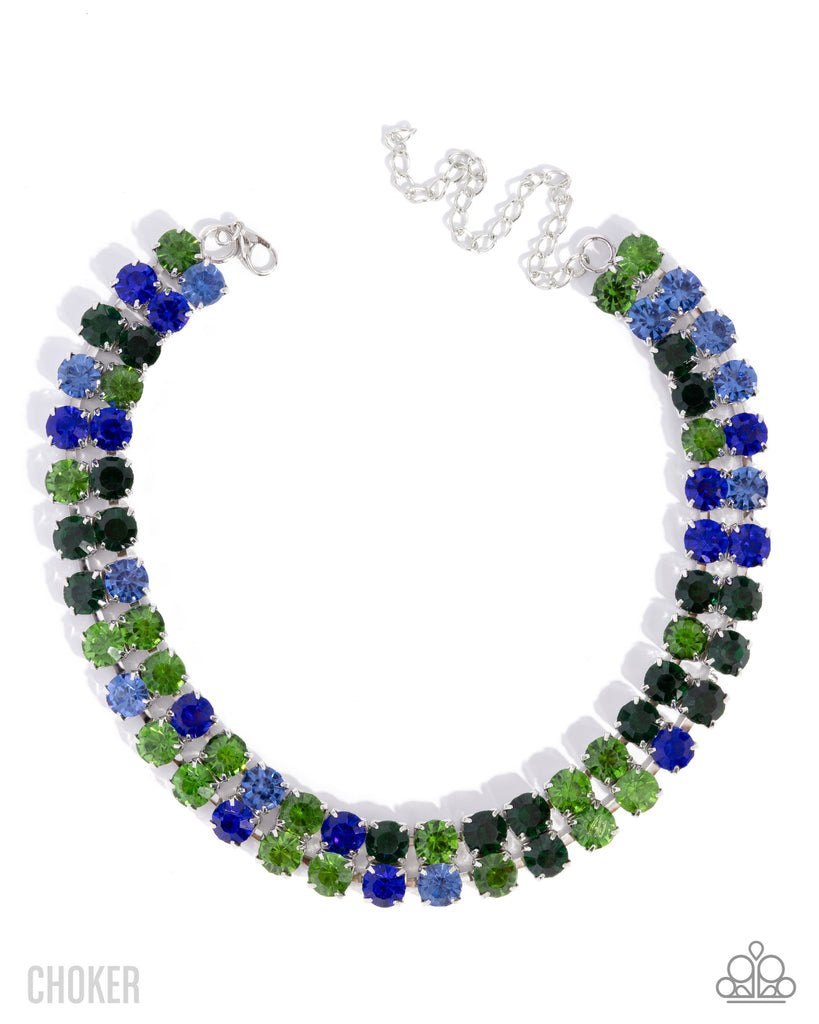 Pronged in silver square fittings, a collection of multicolored blue and green gems layers in glassy rows below the neckline for a colorfully chic display. Features an adjustable clasp closure.