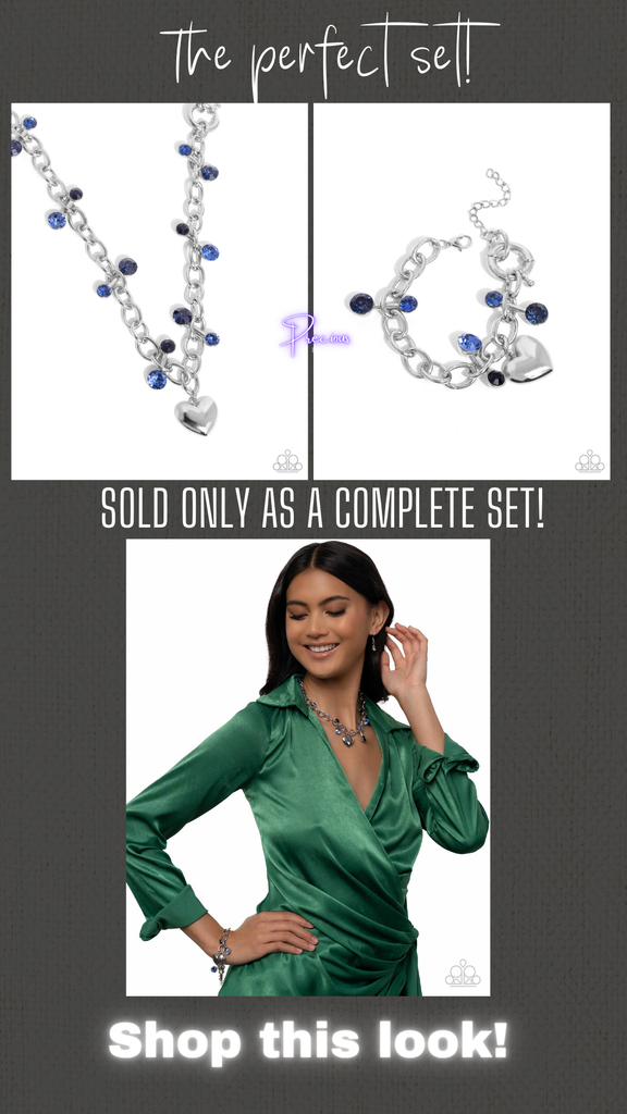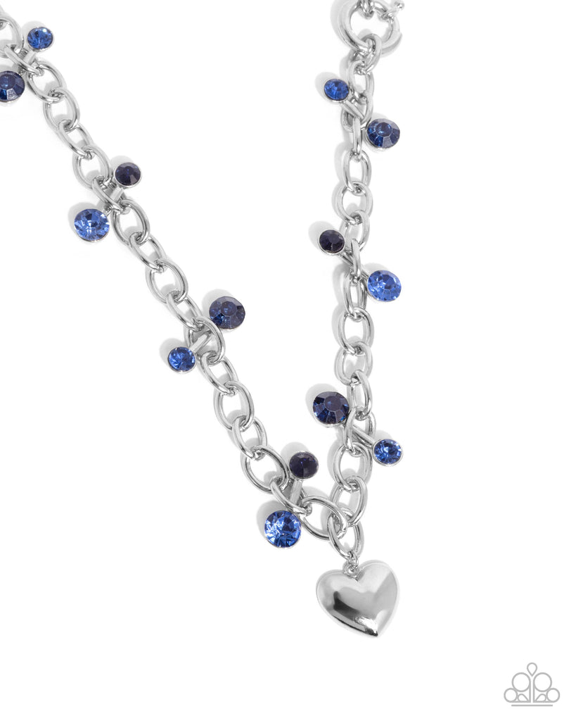 Sporadically threaded through the links of an oversized glistening silver chain, silver bars dotted with haphazardly sized Montana, and light sapphire rhinestones alternate in direction along the neckline. A solitaire silver heart charm swings from the center of the display for a romantic finish. Features an adjustable clasp closure.