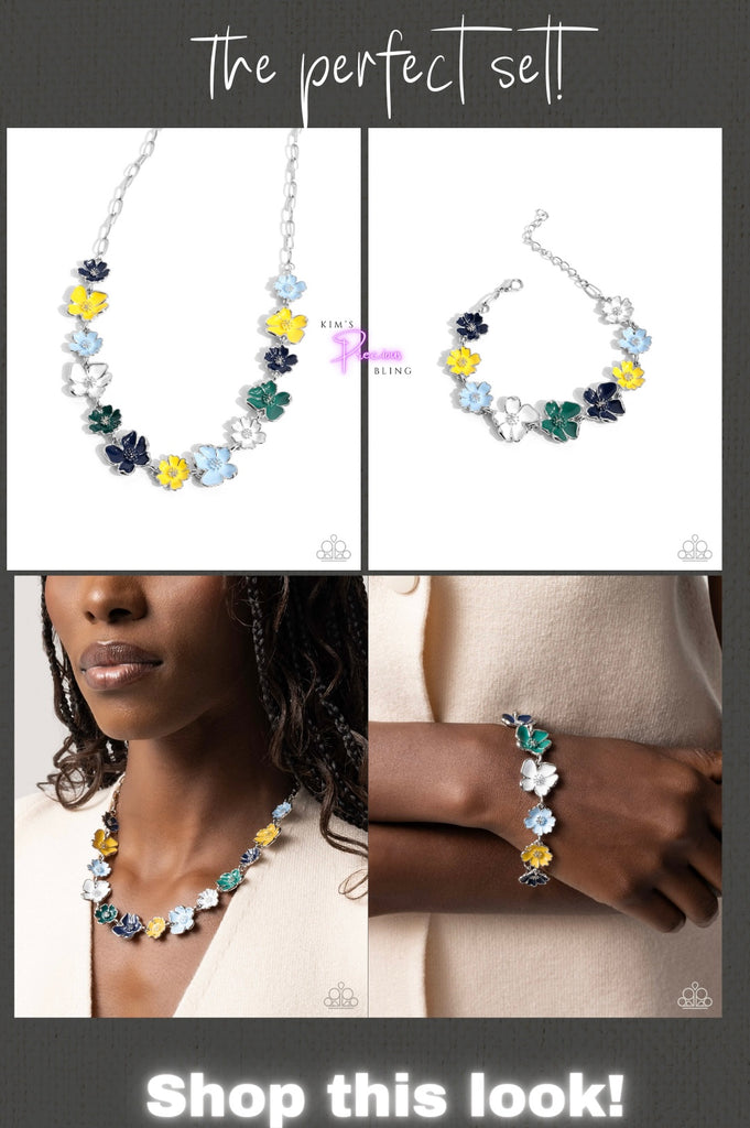A row of colorfully navy, yellow, Winter Sky, white, and Aventurine-painted flowers blooms to life along the collar from a silver paperclip chain, creating a vibrant statement piece. Each flower features a silver-studded centerpiece, flawlessly sprinkling the design with whimsical detail. Silver edging outlines some of the layered petals, emphasizing the handcrafted character of the design. Features an adjustable clasp closure.