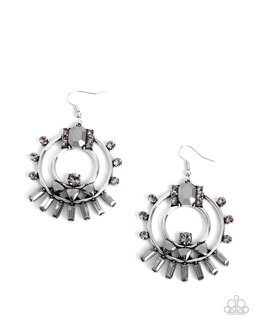 Etched in glistening texture, a duo of silver rings, sporadically dotted with smoky round and emerald-cut rhinestones, a trio of triangular-cut hematite gems, and a solitaire, larger smoky rhinestone are threaded along an emerald-cut hematite gem with a trio of smoky rhinestones bordering it, layering into a dizzying hoop. Earring attaches to a standard fishhook fitting.
