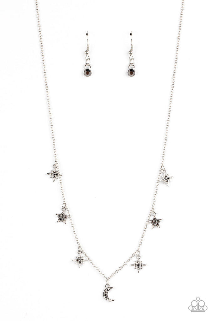 Dotted with dainty hematite rhinestones, a stellar collection of silver moon and star charms swing from a dainty silver chain below the collar, creating a cosmic fringe. Features an adjustable clasp closure.