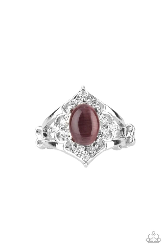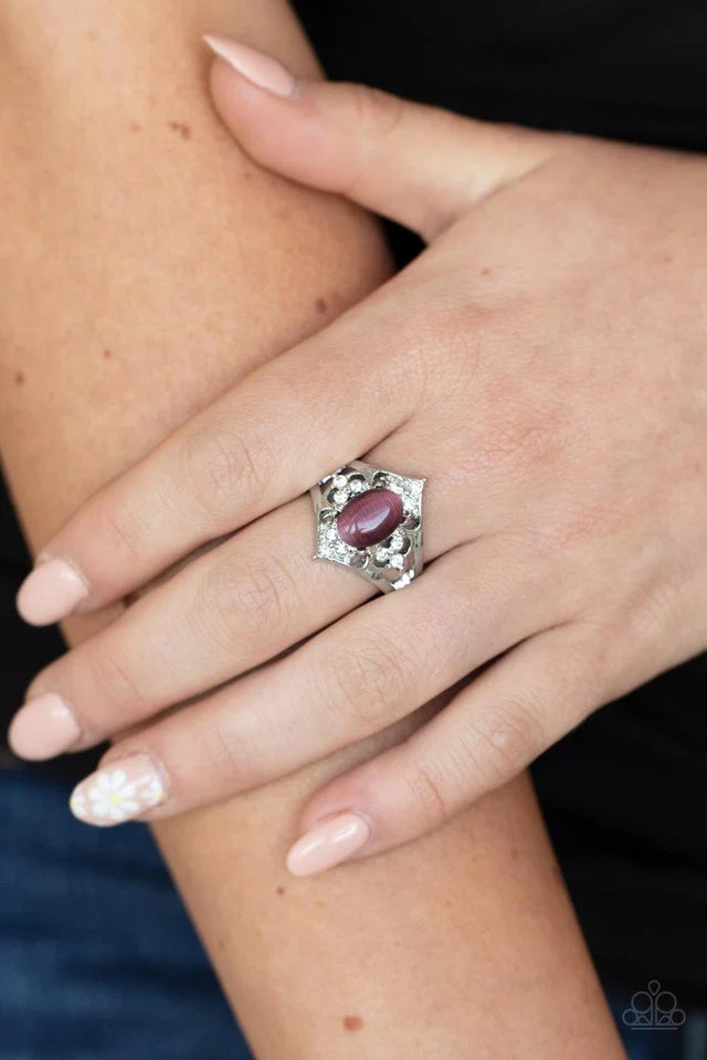 An oval purple cat's eye stone adorns a backdrop of silver vine-like filigree and glittery white rhinestones, creating a regal centerpiece atop the finger. Features a stretchy band for a flexible fit.