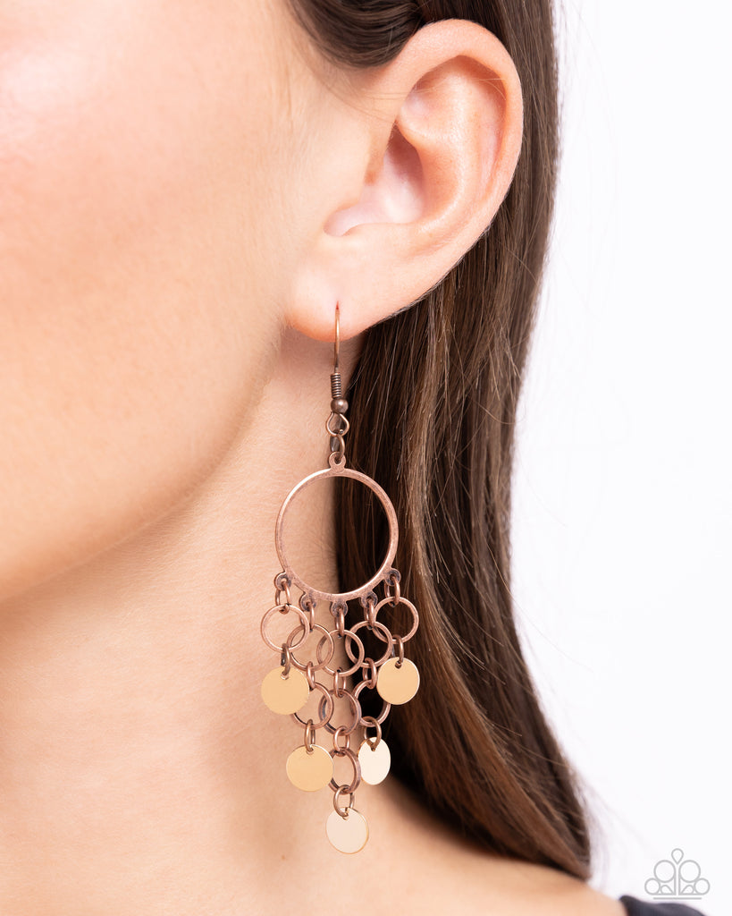 Tapered rows of gold discs and dainty copper rings cascade from the bottom of an airy copper hoop, creating a chime-like fringe. Earring attaches to a standard fishhook fitting.