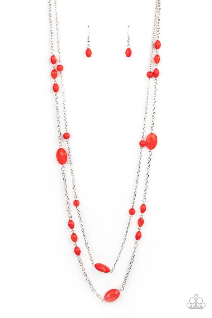A pair of lengthened silver chains are accented with bright red faceted beads in varying sizes for a delightfully whimsical display. Features an adjustable clasp closure.