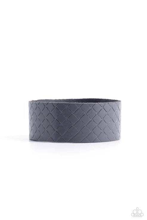 Stamped in a tactile diamond pattern, a shiny piece of Ultimate Gray leather wraps around the wrist for a rustic flair. Features an adjustable snap closure.