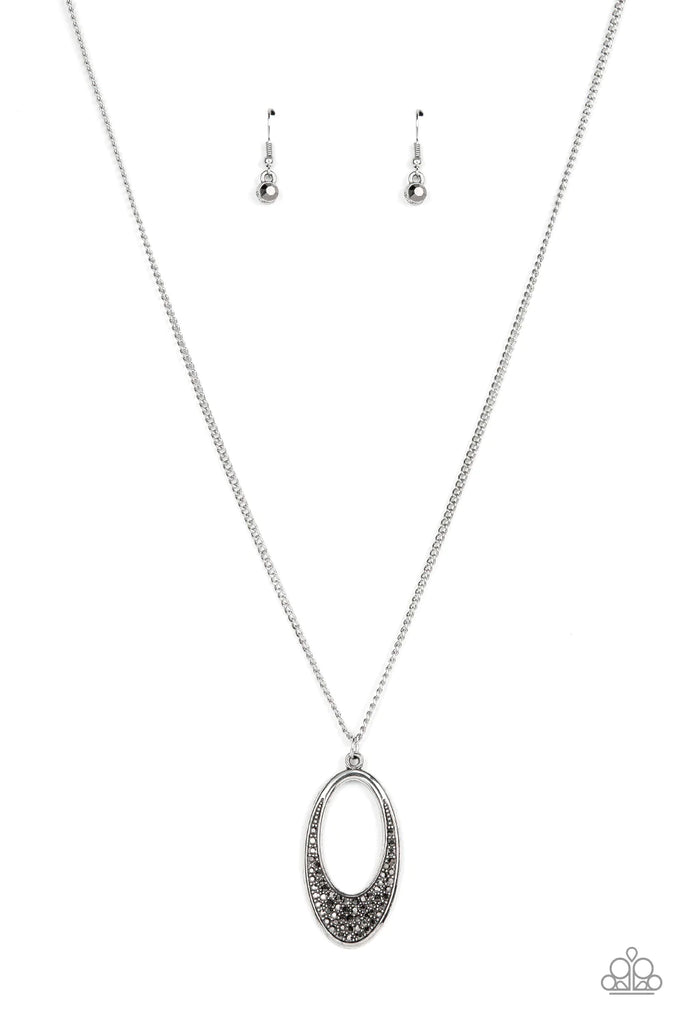 Encrusted with smoky hematite rhinestones, a simple oval frame featuring an airy oval cutout creates a stylishly modern pendant at the end of a lengthened silver chain. Features an adjustable clasp closure.
