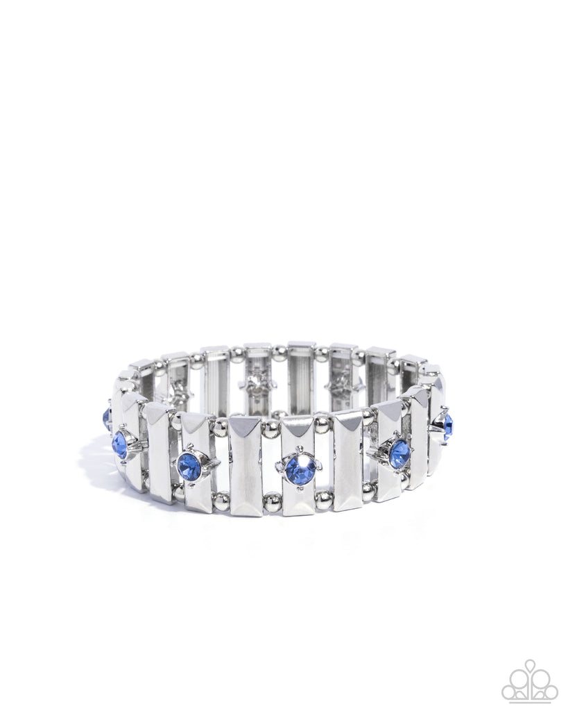 Threaded along invisible stretchy bands, sleek silver bars pattern with dainty silver studs as they wrap around the wrist. Brilliant blue rhinestones dot every other bar to add a symmetrical refinement to the piece.