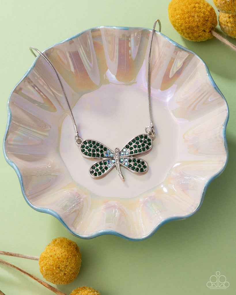 Suspended from a silver snake chain, a whimsical dragonfly pendant encrusted with emerald green and blue-iridescent rhinestones, creates a sparkling and colorful design. The intricate details and shimmering accents bring the dragonfly to life. Features an adjustable clasp closure.