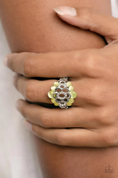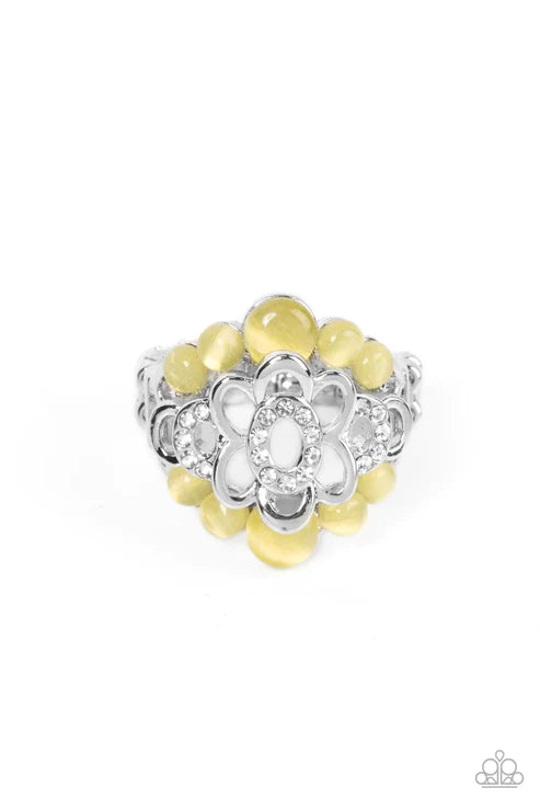A white rhinestone dotted silver flower blooms atop bubbly yellow cat's eye stone borders, coalescing into an effervescent sparkle atop the finger. Features a stretchy band for a flexible fit.