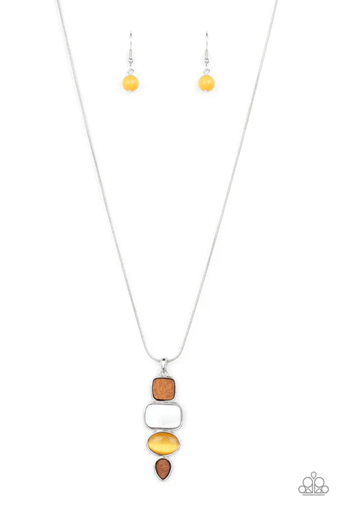 Encased in sleek silver fittings, an earthy collection of wooden, white stone, and yellow cat's eye frames stack at the bottom of a dainty silver snake chain for a tranquil fashion. Features an adjustable clasp closure.