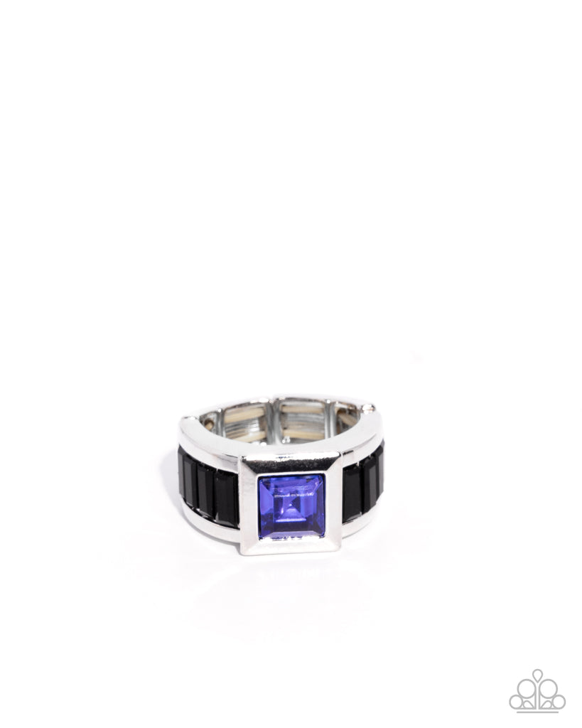 Pressed in a silver square, a blue gem stands out atop the finger beside emerald-cut black gems along the finger for an upscale urban display. Features a stretchy band for a flexible fit.