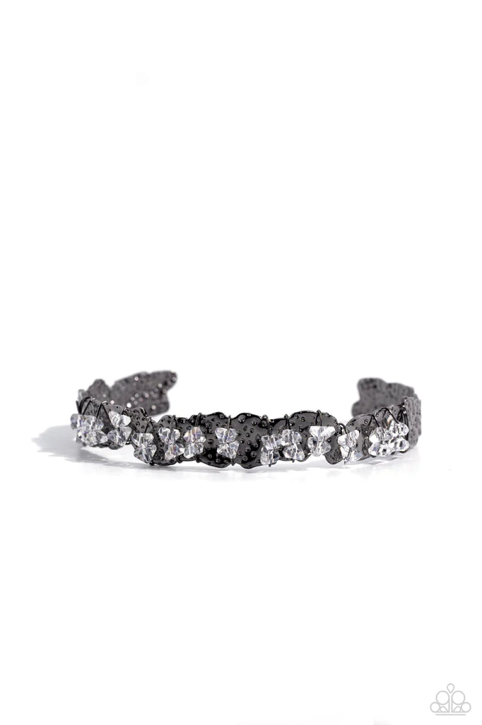 Featuring raw cuts, pairs of icy white gems are fitted in place across the center of a hammered and asymmetrical gunmetal cuff with dainty gunmetal wires. Reminiscent of ice, the sharp rhinestone accents are haphazardly placed, creating an enviable edge.