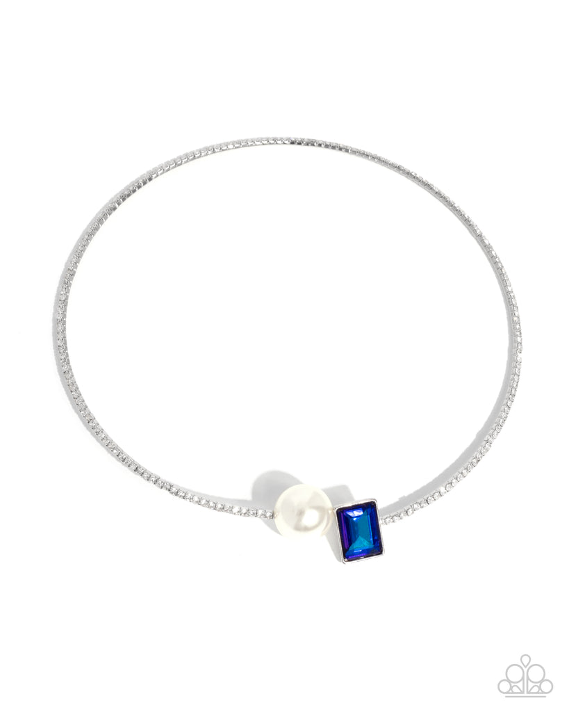 A sleek silver flex collar is adorned with an oversized pearl on one end, and a radiant emerald-cut blue UV gem on the other. Dainty white rhinestones in square fittings are fused together along the collar for a sophisticated statement piece. Features an open-ended design.