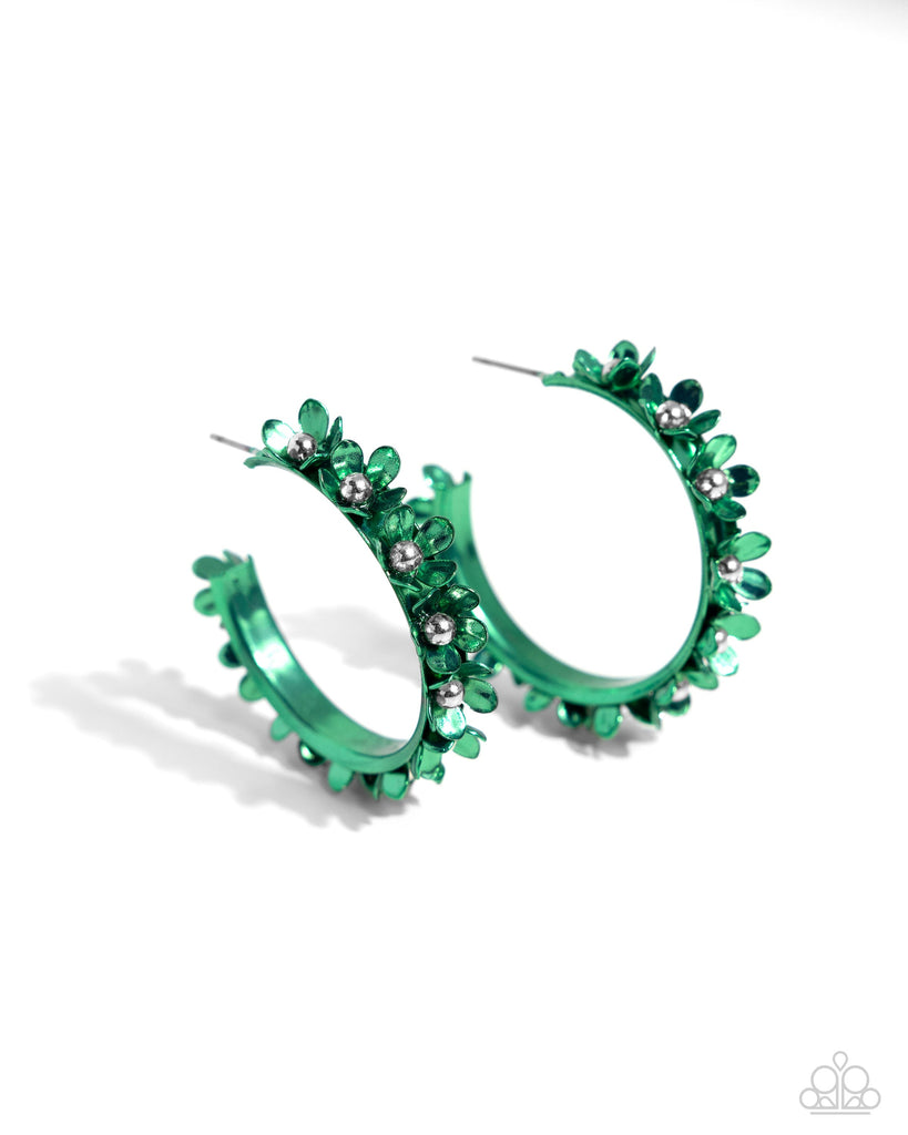Dipped in an emerald hue, a hollowed-out hoop curls around the ear. Featuring silver beaded centers, metallic emerald flowers bloom along the curl of the hollow of the hoop for a fashionable display. Earring attaches to a standard post fitting. Hoop measures approximately 1 1/4" in diameter.