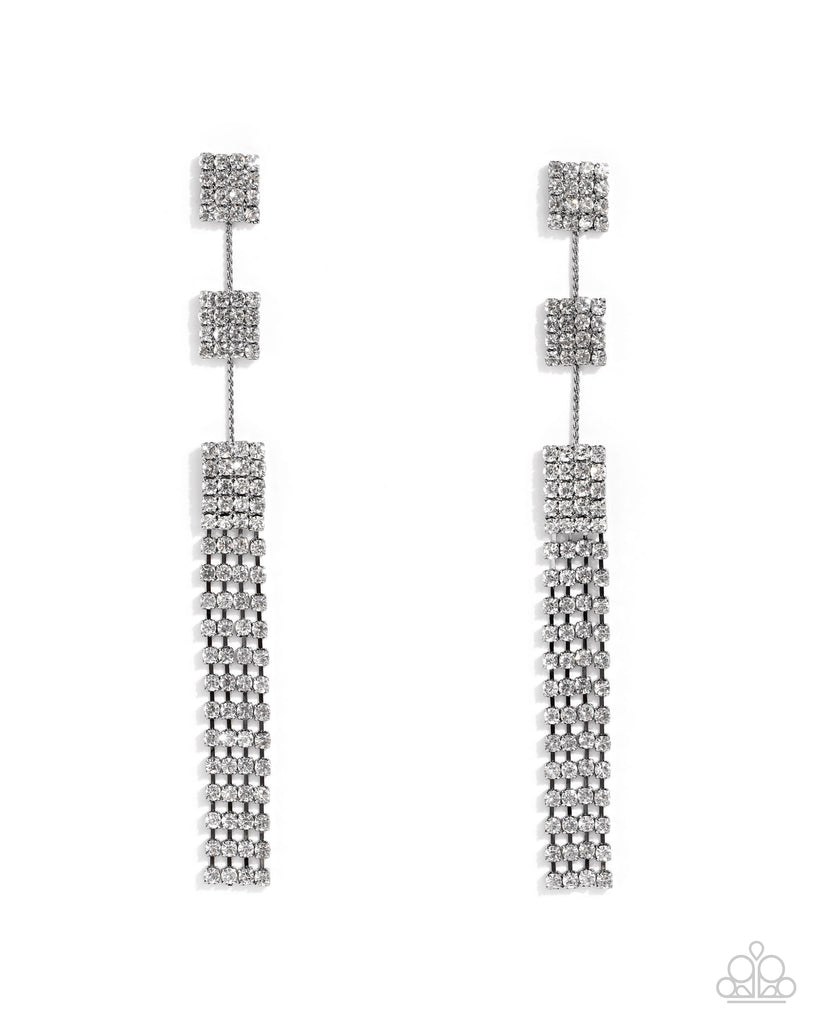 Enveloped in white rhinestones, three interconnected gunmetal square frames cascade down the ear resulting in a dazzling drop of glitz. Featuring sleek square fittings, strands of glittery white rhinestones freefall from the lowermost square frame, creating a glamorous fringe. Earring attaches to a standard post fitting.