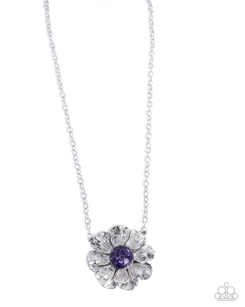 A silver chain displays a bold floral pendant featuring layers of textured silver petals encircling a vibrant purple stone. The intricate detailing creates a rustic yet elegant look. Features an adjustable clasp closure. As the stone elements of this piece are natural, some color variation is normal.