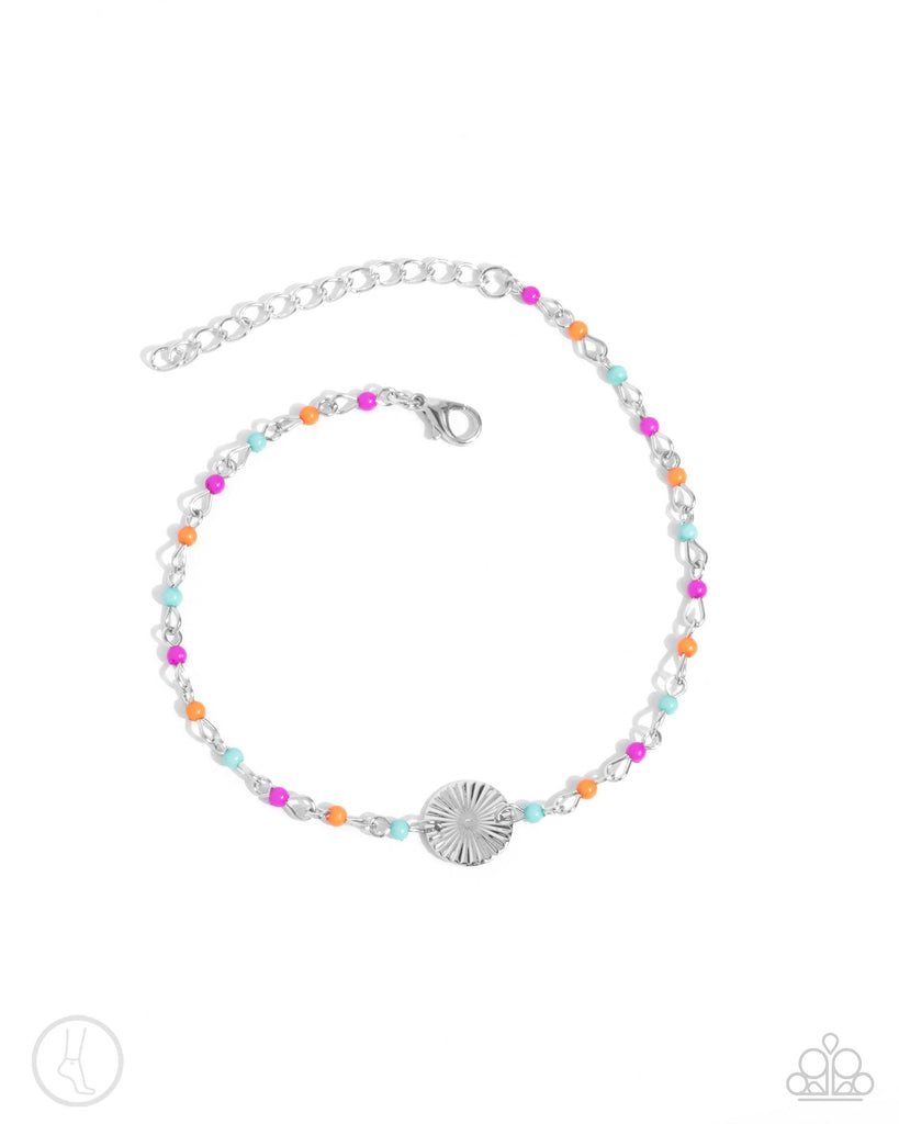 A collection of dainty Arcadia, orange, and fuchsia beads alternate around the ankle in a freestyling pattern, leading the eye to a silver spiral pendant. Features an adjustable clasp closure.