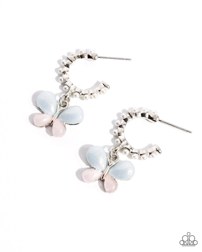 Pressed in a scalloped silver fitting, white pearls curl around the ear for a refined fashion giving way to a silver butterfly with blue and baby pink sparkly resin wings for a whimsically sophisticated look. Earring attaches to a standard post fitting. Hoop measures approximately 5/8" in diameter.