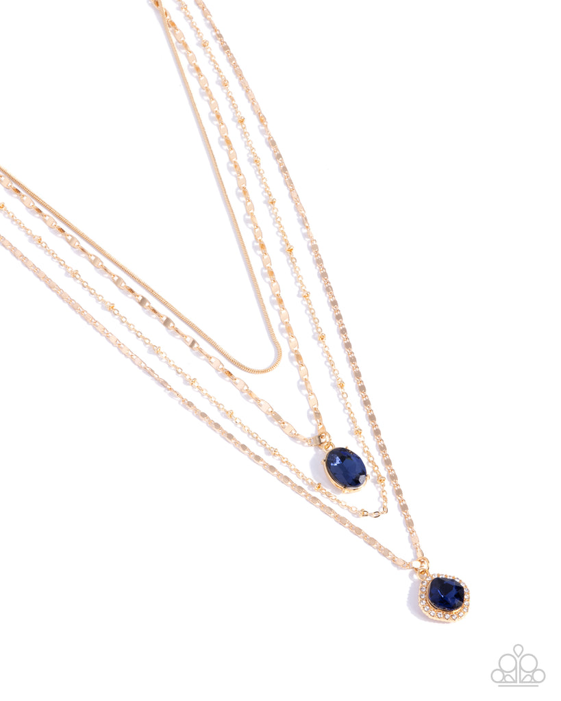 A quartet of mismatched dainty gold chains including snake, abstract, and satellite paperclip, coalesce below the neckline in classy layers. Pronged in gold fittings, an oval blue gem glides along the uppermost abstract chain while a white rhinestone-bordered asscher-cut blue gem glides along the lowermost abstract chain for a colorful finish. Features an adjustable clasp closure.