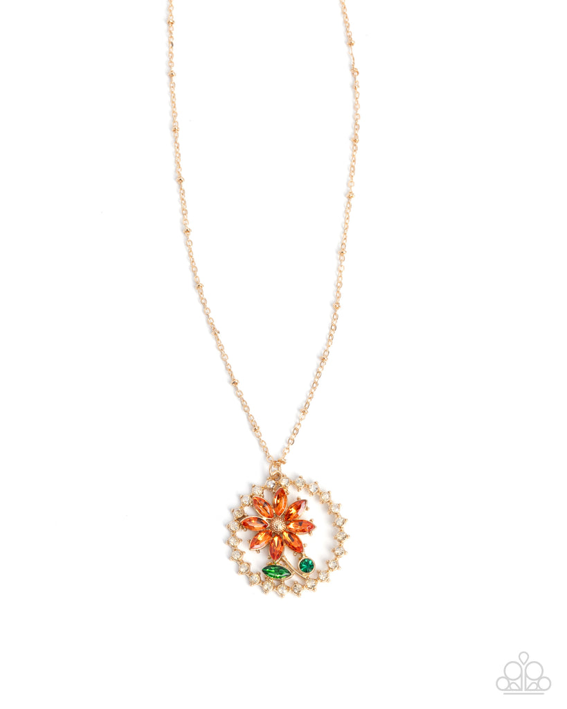 Featured at the center of a gold-pronged white rhinestone pendant silhouette, an orange marquise-cut sunflower complete with a green leaf gem and additional green rhinestone detailing stands out below the neckline from a gold satellite chain for a floral flair. Features an adjustable clasp closure.
