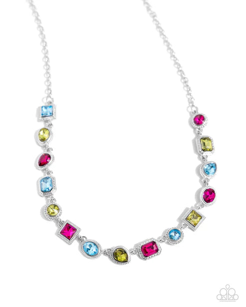 Featuring shades of aquamarine, olive, and fuchsia, subtly textured circle, teardrop, and emerald-cut silver frames connect around the neckline for a glittering display of eye-catching color and detail. Features an adjustable clasp closure.
