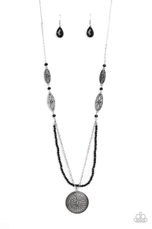 Black beads separated by silver floral-like filigree ovals glide down to a shimmery pendant with floral-like filigree details encased in a circular frame. A strand of black beads adds a layer to this graceful shimmering mandala-inspired piece. Features an adjustable clasp closure.