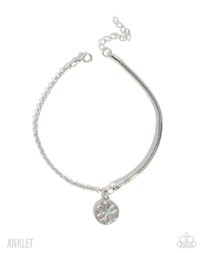 A cable chain strand collides with a singular snake chain to create an abstract blend of grit and glitz. Featuring an aquamarine dainty rhinestone, a floral-embossed silver disc sways at the center of the contrasting design for a balancing blooming finish. Features an adjustable clasp closure.