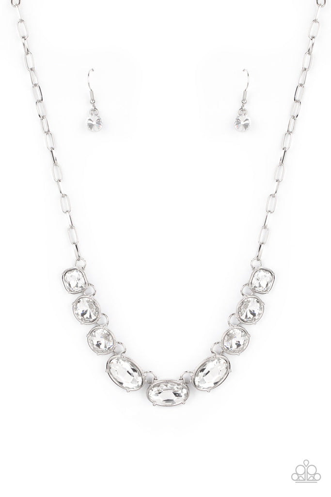 Featuring mismatched round, oval, and square cuts, a glittery row of dramatically oversized white rhinestones delicately link below the collar for an icy finish. Features an adjustable clasp closure.