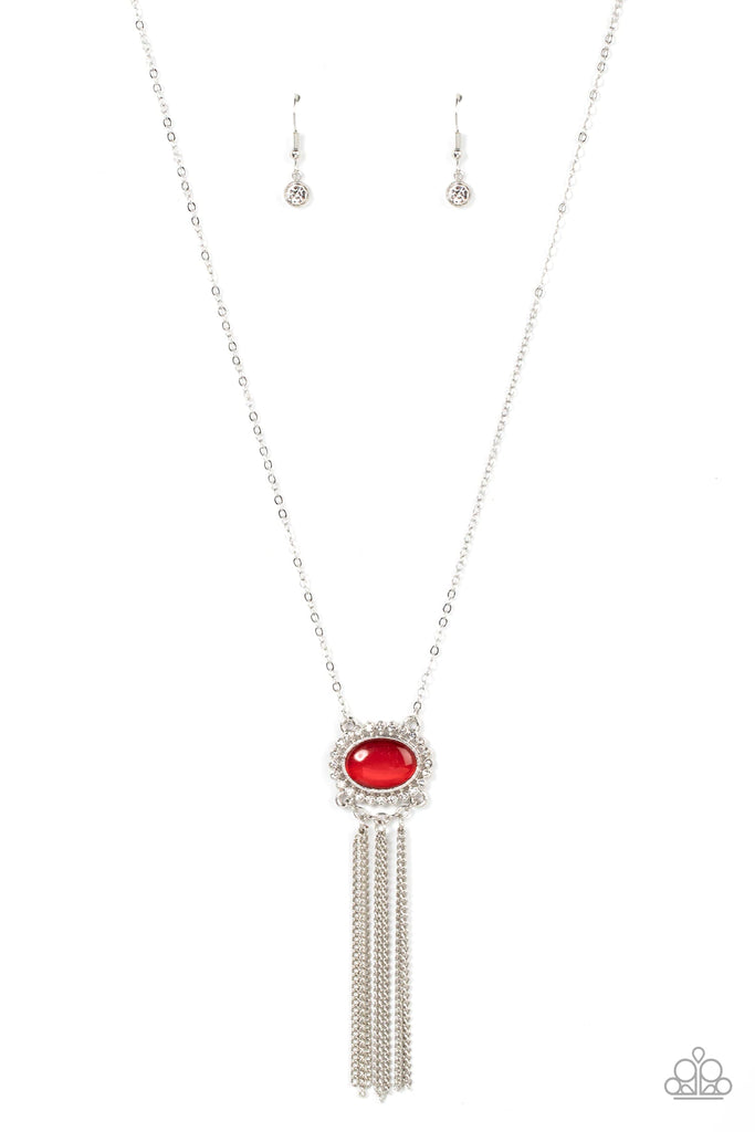 Attached to silver prongs, glassy white rhinestones radiate out from a red cat's eye stone at the bottom of a dainty silver chain. A curtain of shimmery silver chains streams from the bottom of the ethereal pendant, adding playful movement to the colorful display. Features an adjustable clasp closure.