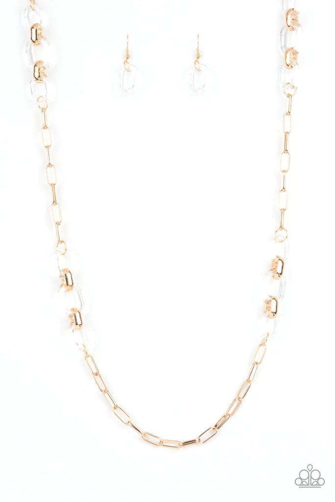 Sections of oversized clear acrylic and bold gold links connect with an exaggerated gold chain across the chest, creating an intense industrial display. Features an adjustable clasp closure.