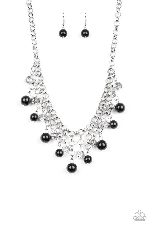 A collection of bubbly black beads, glittery white rhinestones, and ornate silver beads swing from the bottom of a shimmery silver chain, creating a refined fringe below the collar. Features an adjustable clasp closure.