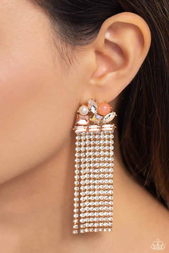 Featuring pronged gold fittings, a trio of peachy emerald-cut gems lay across the ear in a horizontal manner. Various peachy, white, and iridescent gems and a milky orange bead and white pearl haphazardly cluster up the ear from the horizontal layer for additional eye-catching detail. Strands of white rhinestones in sleek gold square fittings cascade from the emerald-cut layer, creating freefalling glitzy movement.